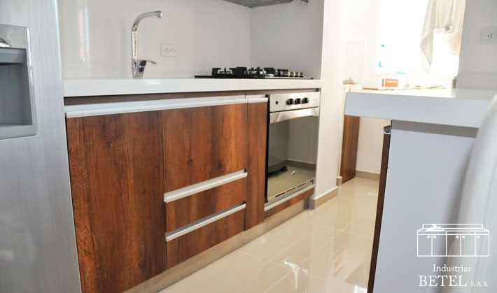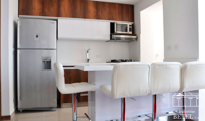 Mesa y enchape de pared en Quarztone blanco polar, pozuelo sencillo en acero inoxidable, sin griferÃa, ni accesorios. Puertas e interior madecor RH, tiradera metálica continua, puertas de gabinete superior con brazo neumático estándar, puertas en vidrio con marco en aluminio. Barra americana en Quarztone blanco polar 160*76.
